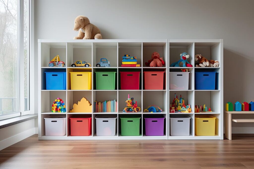 Otvorene police nude brz pristup igračkama i olakšavaju djeci da vide što imaju. Postavljanje raznobojnih kutija na policama dodatno potiče organizaciju po vrsti ili veličini.